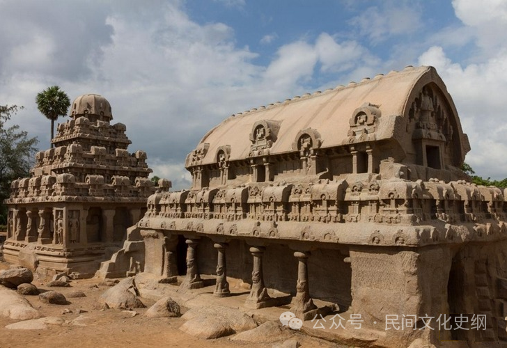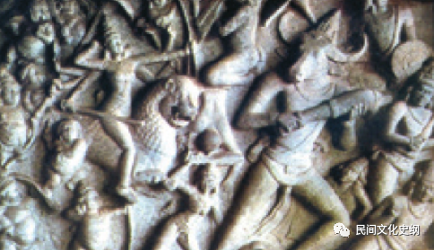马摩拉普拉姆,在这些小神庙的内部,两端壁上都是大幅浮雕。这幅浮雕描写湿婆配偶的化身杜尔伽(难近母)骑狮率侏儒军战士奋战牛头怪的故事。气氛热烈,构图饱满。