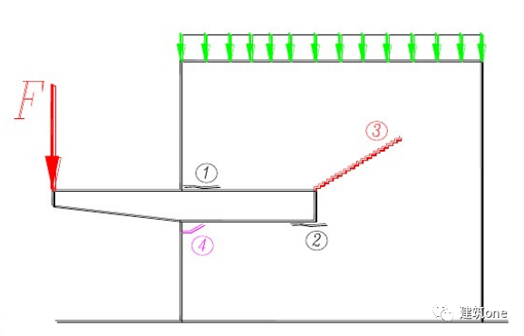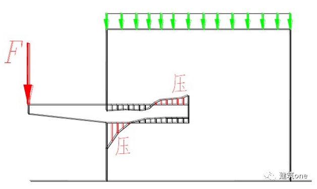 挑梁在未受外荷载之前,墙体自重及其上部荷载在挑梁埋入墙体部分的上、下界面产生初始压应力,当挑梁端部施加外荷载后,挑梁与墙体的上、下界面的竖向压应力如图。随着的增加,将首先达到墙体通缝截面的抗拉强度而出现水平裂缝,如图,出现水平裂缝时的荷载约为倾覆时的外荷载的20~30%,此为第一阶段。