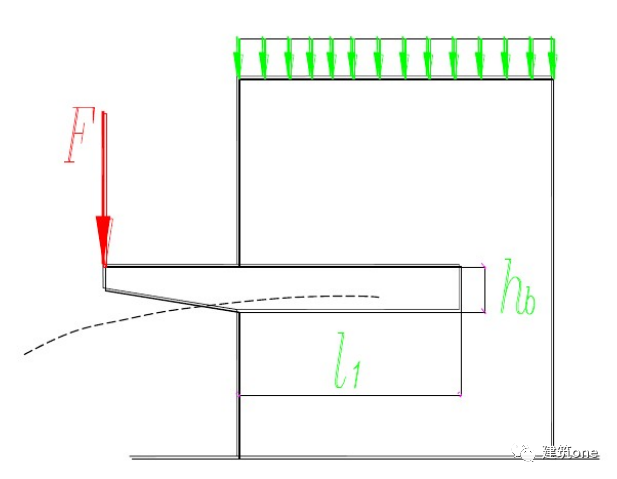(2)当埋入墙内的长度较短,埋入墙内的梁相对于砌体刚度较大,挠曲变形很小,主要发生刚体转动变形,将这种挑梁称为刚性挑梁。嵌入砖墙内的悬臂雨篷梁属于刚性挑梁。