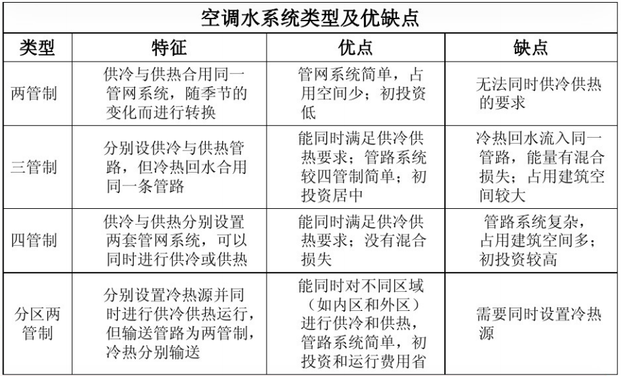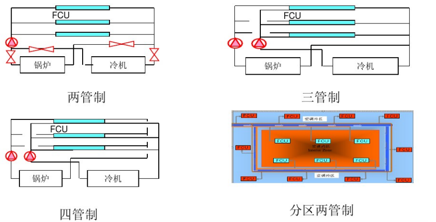 按照水系统管道配置的多少,可以分为两管制、三管制、四管制以及分区两管制方式。