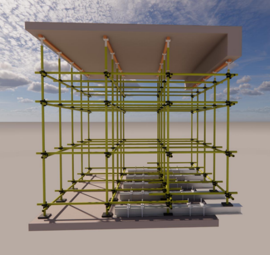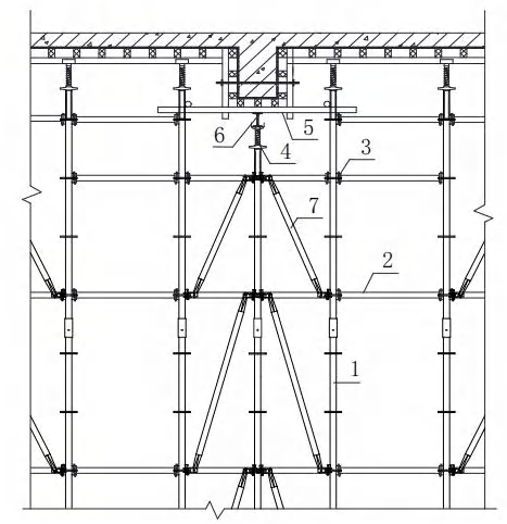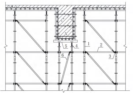 2.梁下设置1排立杆时,梁下立杆居中设置,梁下立杆横向间距为梁两侧立杆横距的一半,梁下立杆顶部可调托撑上部宜设置二级主楞。