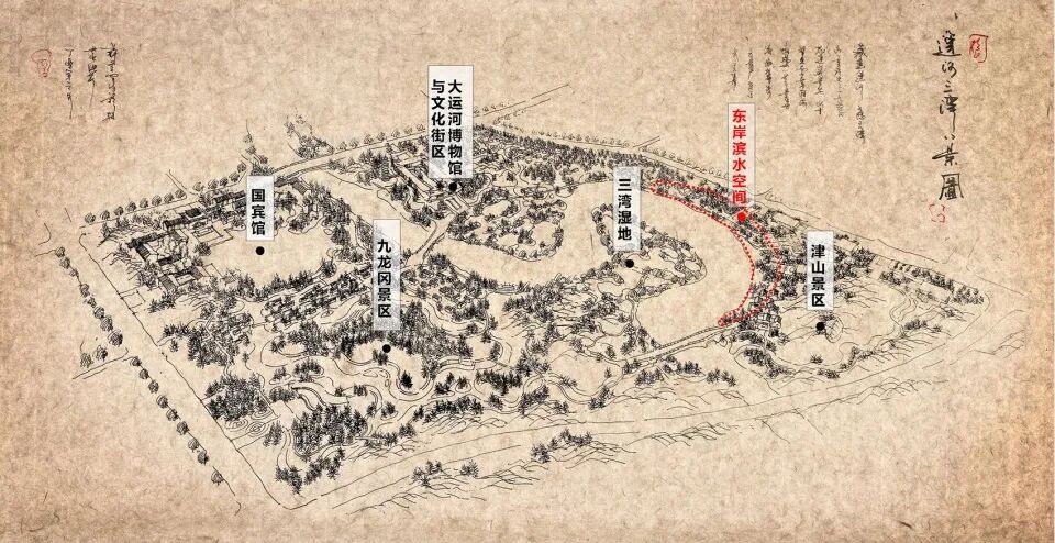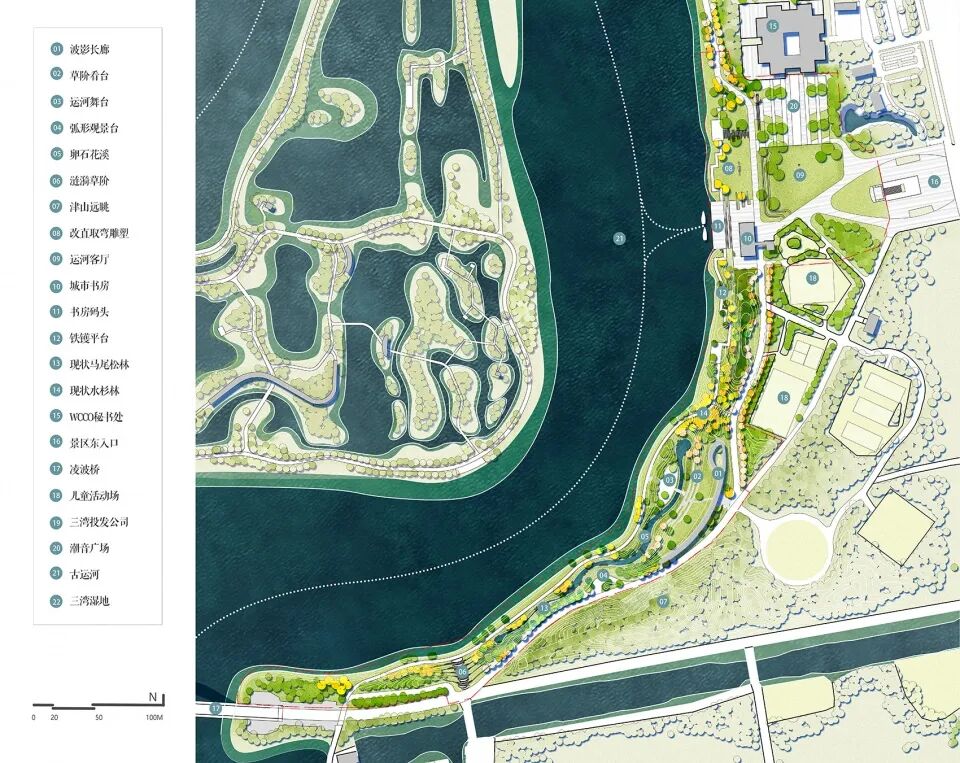 设计以“开放——植入——串联——点睛”为策略,重点开放全线滨水界面,植入“运河客厅”和“运河舞台”两处主题空间,并以绿道和滨水步道串联片区内外部交通,点缀多个与运河共融的特色节点。