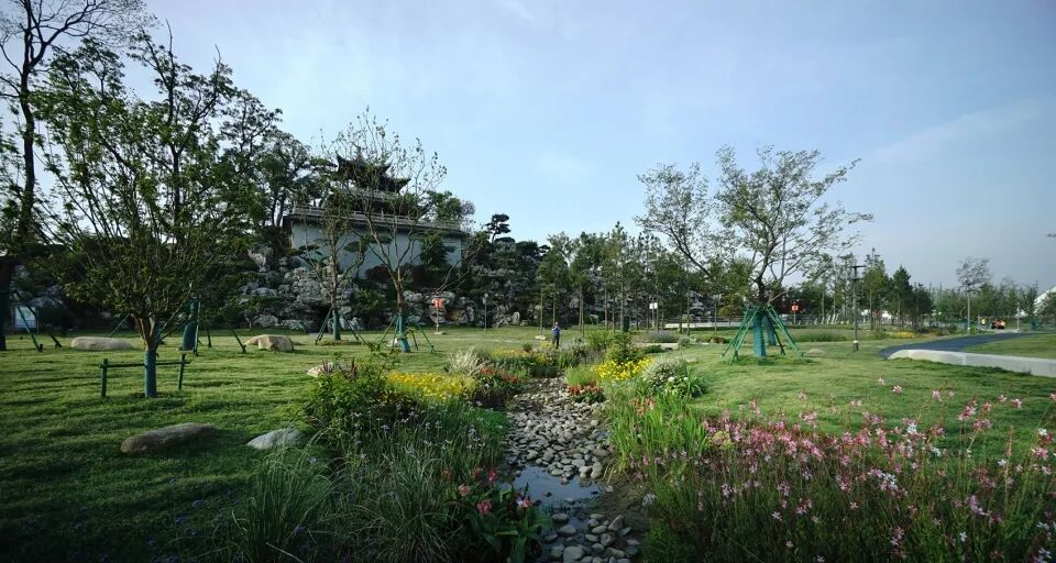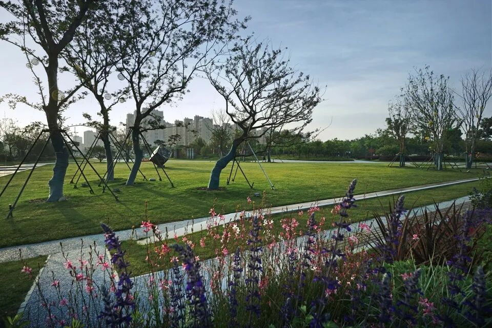 ▲特选朴树与草地花境组合,透景运河又营造中间层次
