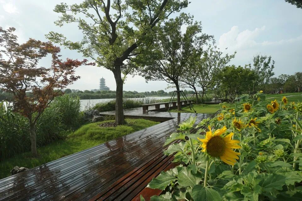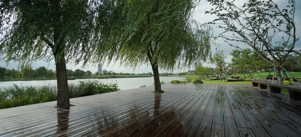 ▲亲水栈道系统与缓坡入水的驳岸相结合
