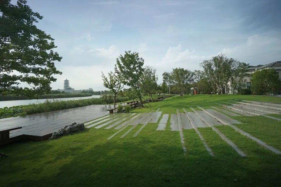 ▲波浪造型的曲线坐凳和嵌草台阶,呼应运河和大运塔的韵律