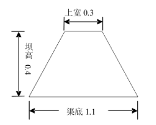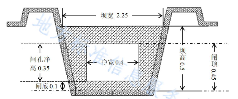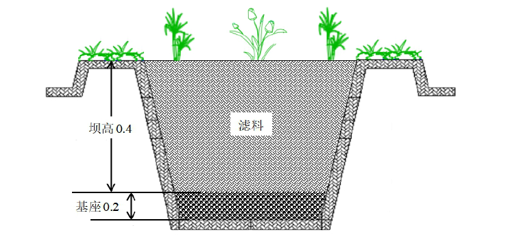 透水坝剖面为梯形复式结构,边坡系数为1:1~1:2.5,透水坝滤料采用炉渣、碎砖、改性生物碳等多孔材料。坝高0.4m,与渠埂持平,基座高0.2m。