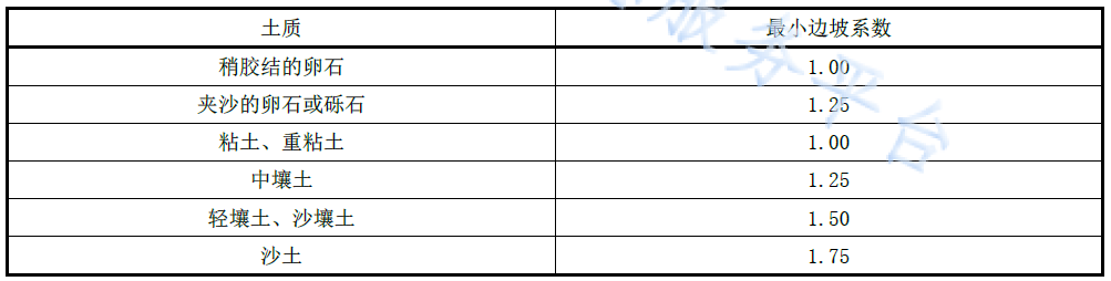 参照大理州、江苏、天津地标,一般要求生态沟渠的渠体断面为等腰梯形,参考设计尺寸:上宽1.5m(或2.5m),底宽1.0m,深0.6m;渠底为土质,渠壁为土质或生态多孔砖,最小边坡系数可按下表确定: