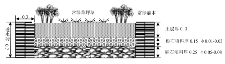参考江苏地标,在生态沟渠的水流转向处建造潜流坝,潜流坝高0.7m,与渠埂等高,坝两侧用透水砖垒砌,透水砖宽0.3m,高0.7m。坝中部填充砾石与黏土,坝顶种植常绿灌木或草坪,坝底0.5m处设置溢流管,管径0.15~0.2m。