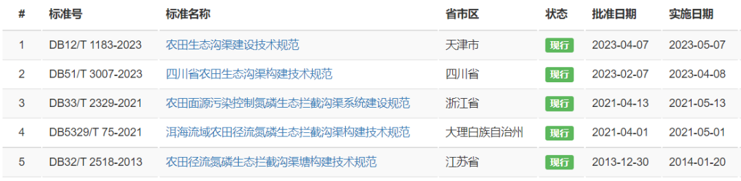 截止目前,已有天津市、四川省、浙江省、江苏省、大理白族自治州等五个省市州出台了生态沟渠建设技术规范,均为地方标准。暂无国家层面标准和行业规范等。在各地出台的标准中,四川省(DB51/T)和大理州(DB5329/T)内容较为全面,参考价值较高,也是本文主要参考的文件。