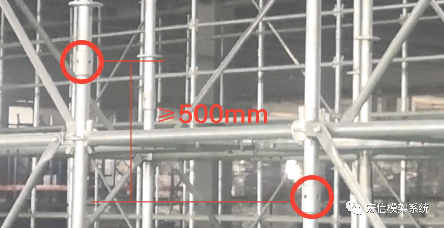 注:相邻底座首根立杆宜采用长度差值≥500mm的立杆(231-2021中已不要求立杆接头错开)。
