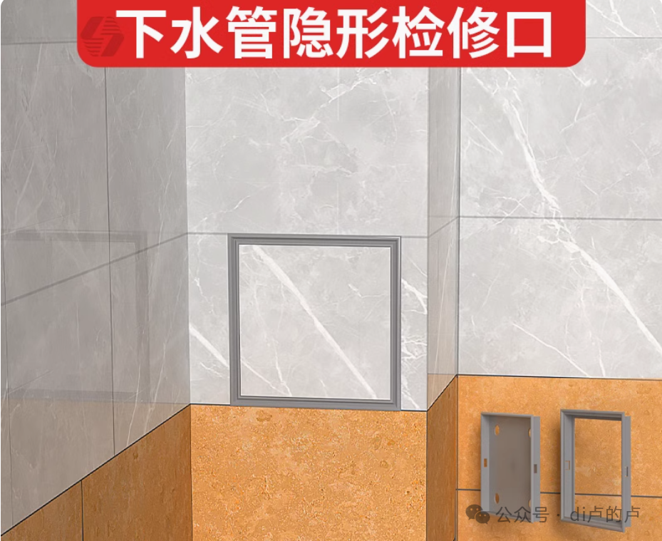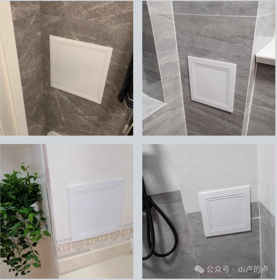 关于检修口的装饰,大家也都是费尽心机,有做钢框架做贴砖暗门的、还有用其他材料临时装饰封堵的,其实这个小的检修口对于美观的影响很小,没必要花大价钱去做,大家可以参考下下边图片的做法(做一个建议的装饰门颜色可以订做也可以自贴画,省时省力还省钱、材质要选用塑料或者不锈钢的)。