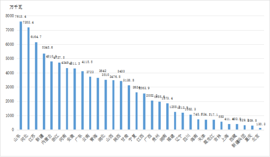 从各省市累计光伏并网情况看,山东以7613.4万千瓦规模继续领跑全国。河北达到7202.4万千瓦,居第二。江苏(6164.7万千瓦)位居第三。新疆(5345.6万千瓦)、内蒙古(4810.9万千瓦)分别位列第四、五名。浙江(4727.5万千瓦)、河南(4349.1万千瓦)、安徽(4311.3万千瓦)、广东(4115.5万千瓦)、云南(3723万千瓦)位居第六到第十位。