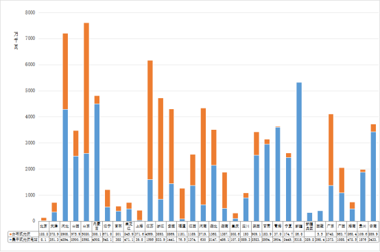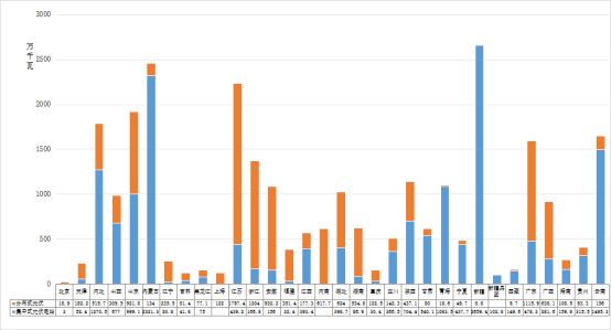 图6 截止到2024年12月底各省市分布式光伏和集中式光伏累计并网装机情况