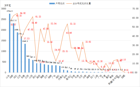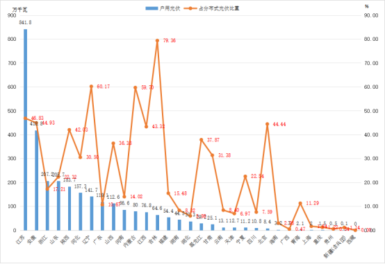 分布式光伏位居前十的省市是:江苏(1797.4万千瓦)、浙江(1204万千瓦)、广东(1115.9万千瓦)、安徽(932.2万千瓦)、山东(921.8万千瓦)、广西(638.1万千瓦)、湖北(624万千瓦)、河南(617.7万千瓦)、湖南(534.8万千瓦)、河北(515.7万千瓦)。