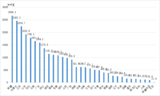 从各省2024年光伏新增并网情况看,新疆以2668.2万千瓦领跑全国,内蒙古(2455.3万千瓦)、江苏(2236.7万千瓦)、山东(1920.9万千瓦)、河北(1786.3万千瓦)分别位列前五名。云南(1651.3万千瓦)、广东(1594.2万千瓦)、浙江(1370.8万千瓦)、陕西(1141.5万千瓦)、青海(1102万千瓦)位居第六到第十位。