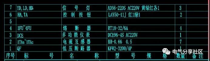 我们根据清单可以很清楚了解到这台柜子使用了什么元器件及型号,而且对于有些没有国标符号的元器件也需要通过元器件确定其名称型号功能。如此图中的多功能仪表DCE, 由于多功能仪表没有国标符号,所以一般可以自主命名但是要注明名称型号。