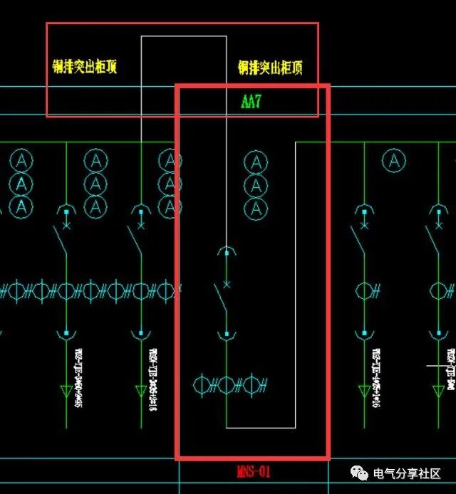 我们可以根据此一次系统图进行分析,柜号AA7, 采用了铜牌突出柜顶的进线方案,也可以侧进,采用了一个可抽出式的框架断路器,采用了三个电流互感器,可能是电流测量。