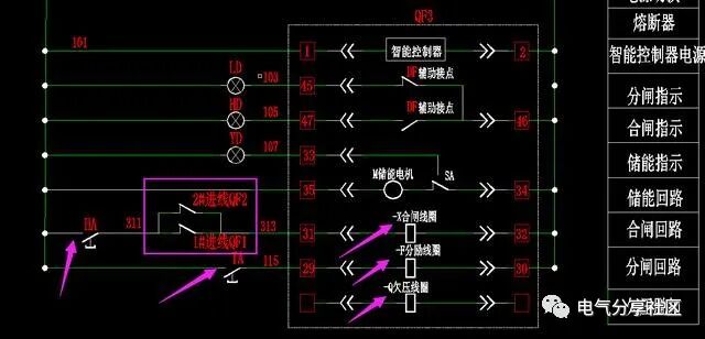 细心的朋友可能发现了一个问题,KA回路串了一个QF常闭点,这里其实是一个互锁回路,当联络柜合闸后QF常闭点断开,使KA断电,避免了其长期带电。