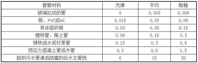 | 清洁无缝钢管、铝管 | 0.0015~0.01 | 新铸铁管 | 0.25~0.42 |