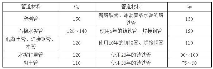 | 内衬水泥、树脂的铸铁管 | 130 | 普通钢管、铸铁管 | 100 |