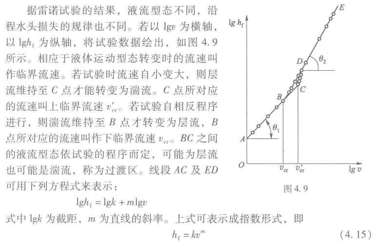 据试验结果:①层流时适用直线AC,θ=45°,即m=1,所以层流时沿程水头损失是与流速的一次方成比例的。