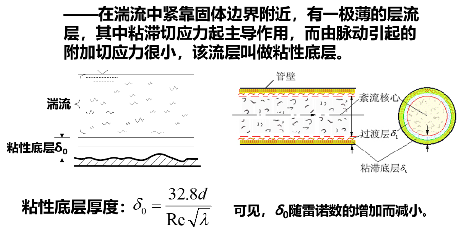 特点:①粘性底层的厚度随雷诺数的增加而减小;