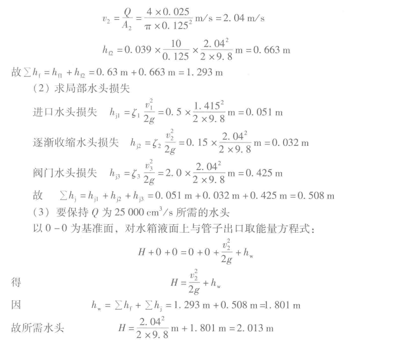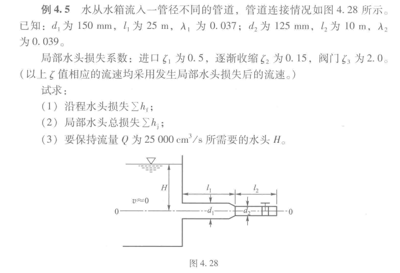 例题1:这例题应该类似于期末考试的难度了,主要考察伯努利方程+沿程水头损失、局部水头损失的计算,算是一种综合题,搞懂这道题期末考试基本问题不大。
