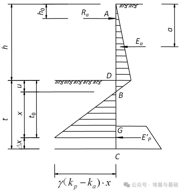 (3)考察BG段,对G点取矩,并令MG=0计算长度x,确定嵌入深度u+x。