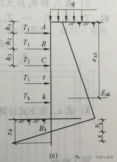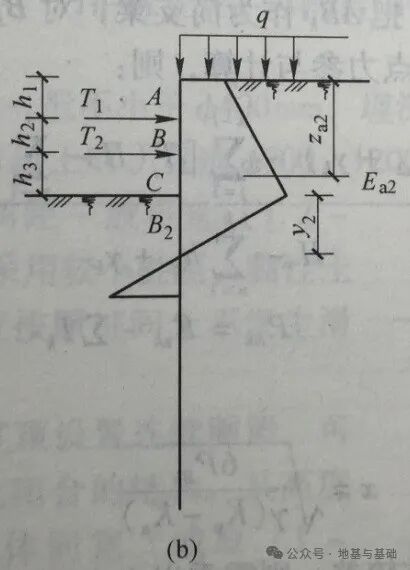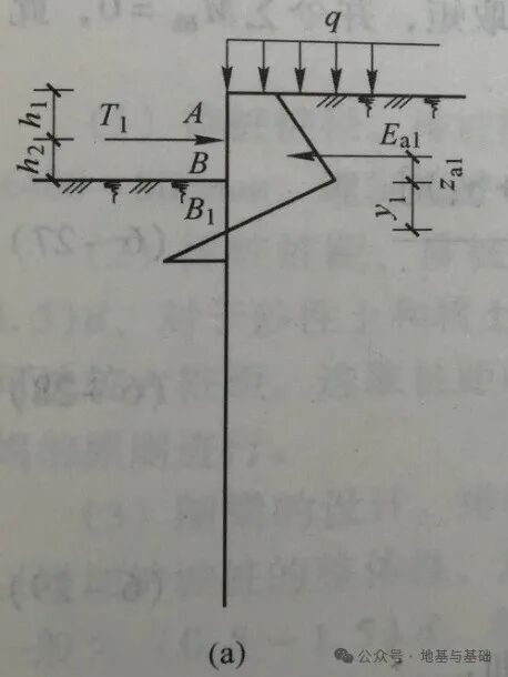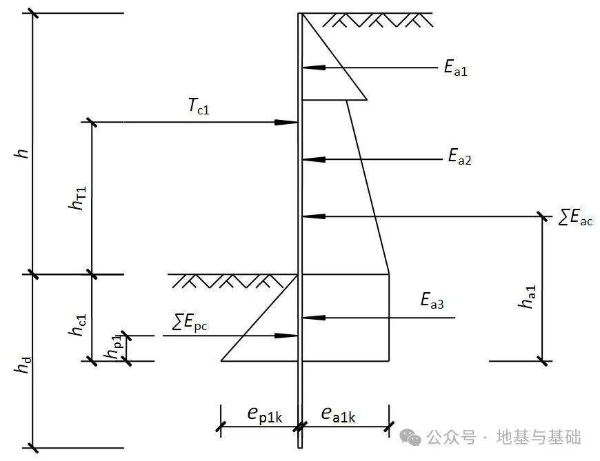 《建筑基坑支护技术规程》(JGJ120)规定,单层支点支护结构的反弯点位置位于基坑底面以下水平荷载标准值与水平抗力标准值相等的位置,即处,则支点力可按下式计算: