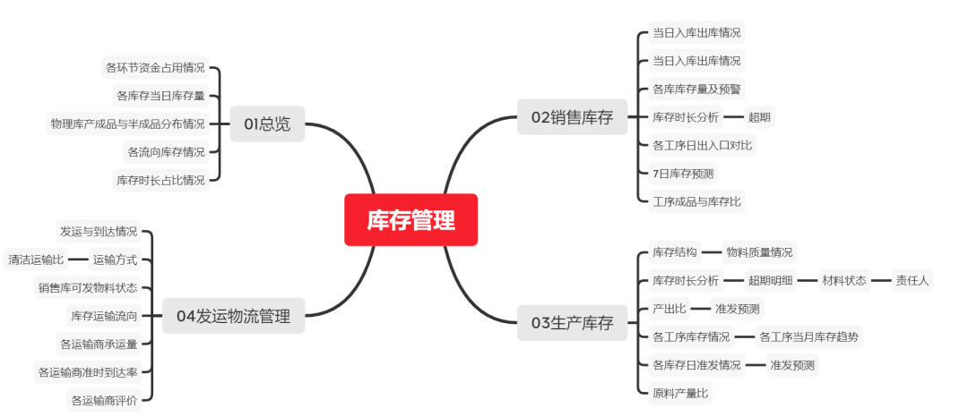 因此,我们需要把物料(钢卷)作为分析的颗粒度,通过多维度的数据分析,完成我们降低库存、减少成品资金占用的目标。具体的库存管理分析可以细分为销售库存分析、生产库存分析,由于库存和发运物流有强相关,因此,我们再加上产品发运分析,具体每个模块的更加细节的分析内容看下图: