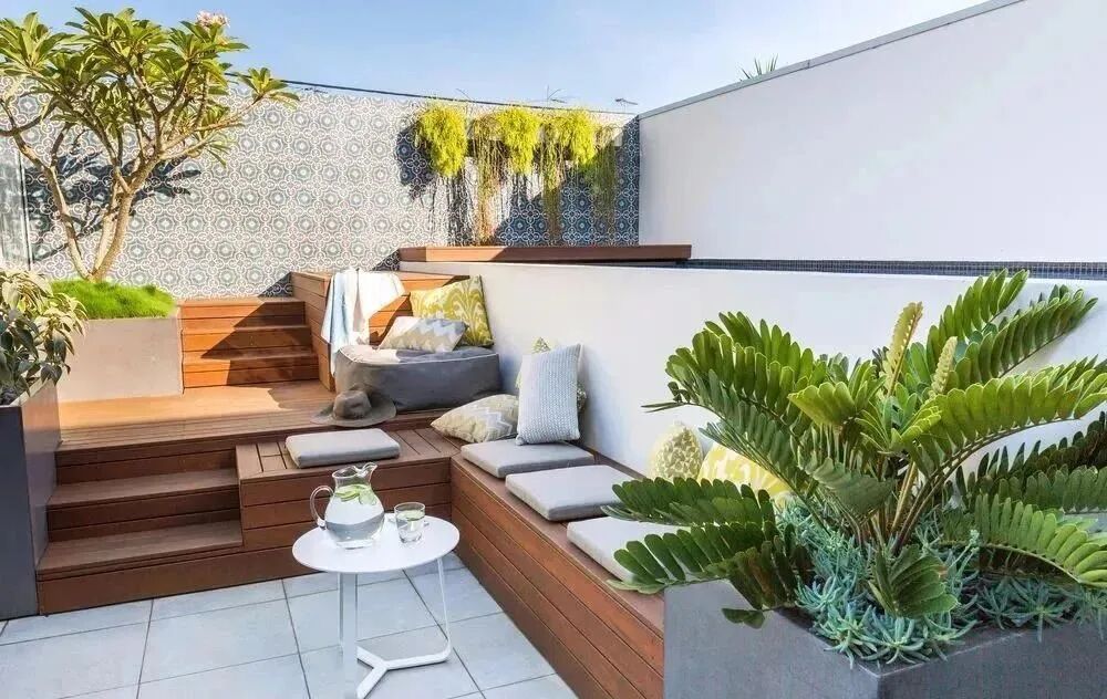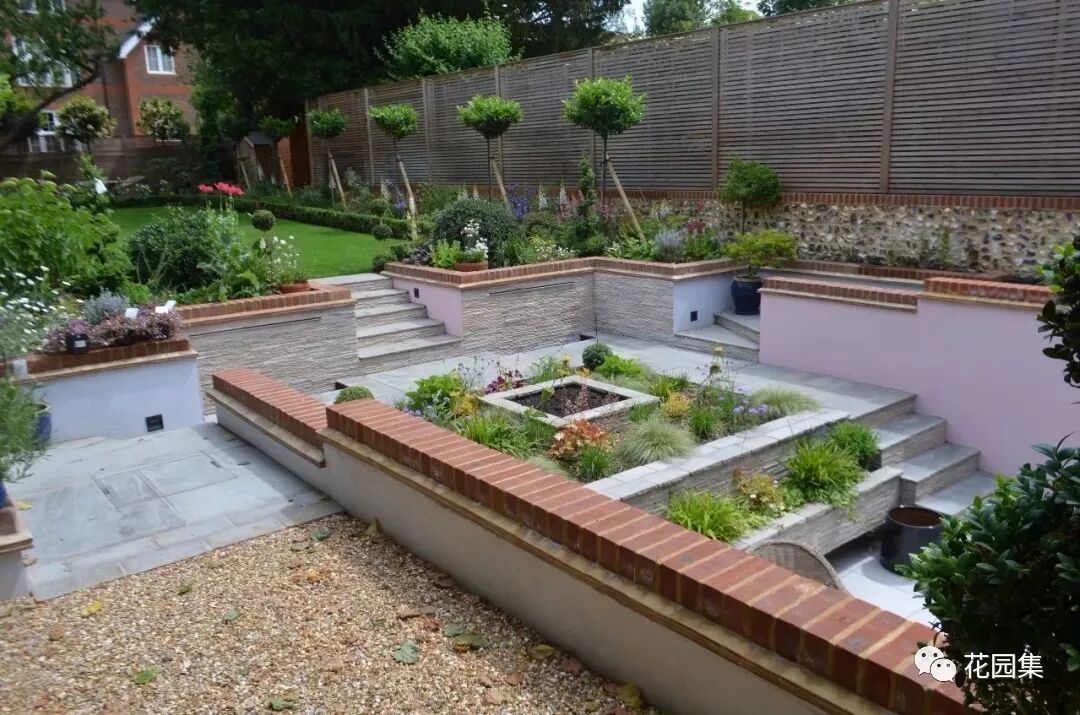 针对中大高差的坡地,我们可以选择尝试做花坛、休闲平台、下沉式庭院之类的设计。