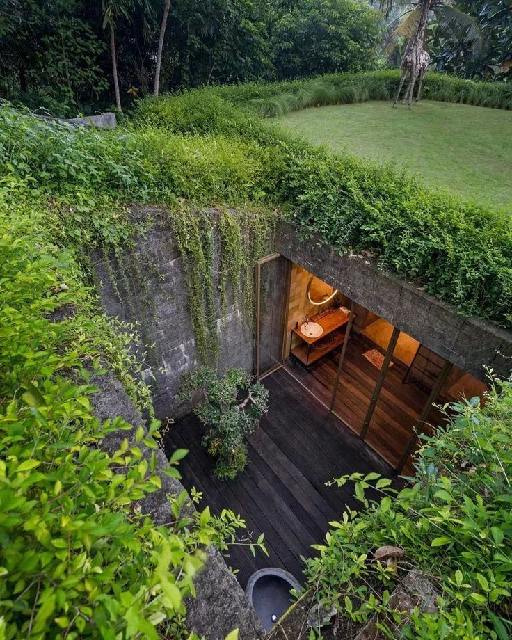 下沉式庭院是最常见的高差处理方式,一般利用前后的高低差,通过人工方式处理高低差和布景,使原本位于地下室的区域拥有面向花园庭院的开放式空间。