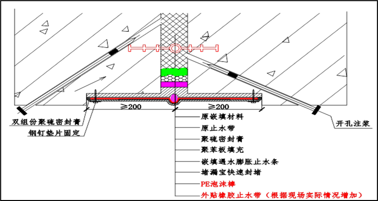 ⑤ 根据现场实际情况及外部环境,安装外贴式止水带,并用钢钉垫片固定;