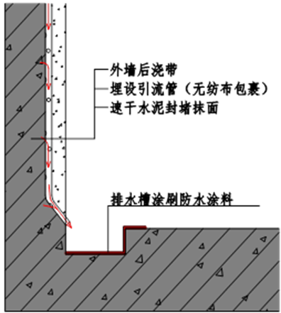 ② 在底板与后浇带交接处(阴角)开凿一条排水槽,水槽导水至地下室集水坑内,水槽内用堵漏宝涂刷抹面;