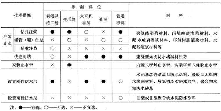 1)注浆止水时,宜根据渗漏量、可灌性及现场环境等条件选择聚氨酯、丙烯酸盐、水泥-水玻璃或水泥基灌浆材料,并宜通过现场配合比试验确定合适的浆液固化时间;