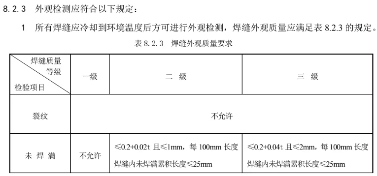 4、焊缝应进行100%的外观检查,且应满足《钢结构焊接规范》中表8.2.3的规定。