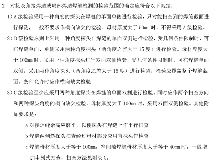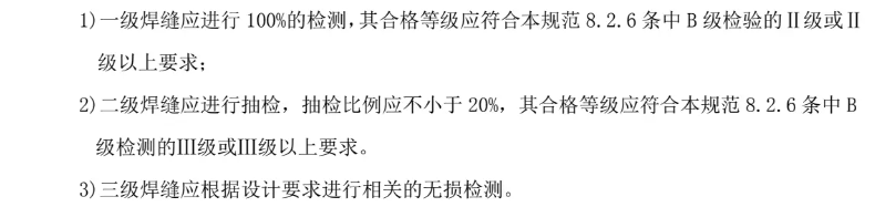 5、根据一、二、三级要求,按《钢结构焊接规范》8.2.5条的数量要求进行无损检测:一级焊缝应进行100%的检测、二级焊缝抽检比例不应小于20%。