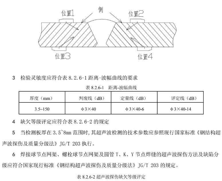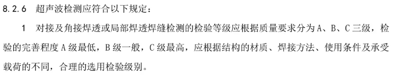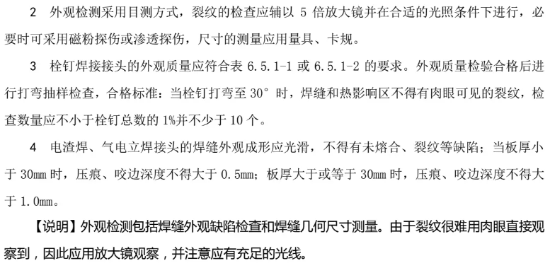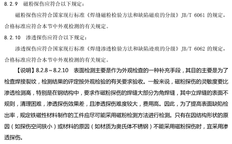 3、检测方法有外观检测(8.2.3条)、磁粉检测(8.2.7条)、渗透检测(8.2.8条)、超声波检测(8.2.6条)、射线检测(8.2.7条),各种方法的适用特点、要求不同,选用时要注意。