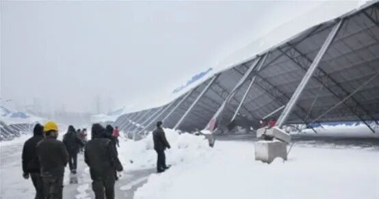 还有一些钢结构大棚、临时工棚、菜市场的屋顶等一般都是找社会上钢结构安装包工头,他们并没有相关资质,也没经设计计算只凭自己经验来对结构进行加工安装,这样的结构也是大雪压垮主要对象。