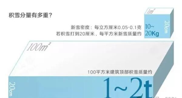 如果新雪的密度约为每立方厘米0.05至0.1克,那么100平方米的平面屋顶,如果积雪厚度为20厘米,房顶就会承受1至2吨的重压。