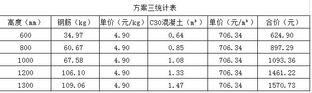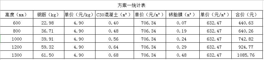 首先,我们按照一般普通单层地下室400mm厚筏板,0.15%最小配筋率进行配筋,底板及侧壁(或放坡处)配筋按C10@125进行设置。然后按不同的高差分别进行造价测算。结果如下图所示: