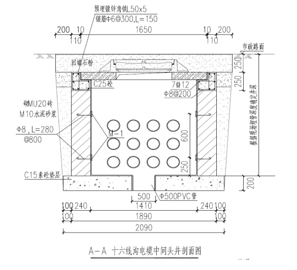 3.3.1 电缆井有直线井、转角井、三通井、四通井,底板为200mm厚C15混凝土垫层,井壁为240mmMU20砖M10砂浆砌筑砌体,底板及内壁15mm厚为1:2砂浆(5%防水剂)抹灰,部分井壁有预埋件。