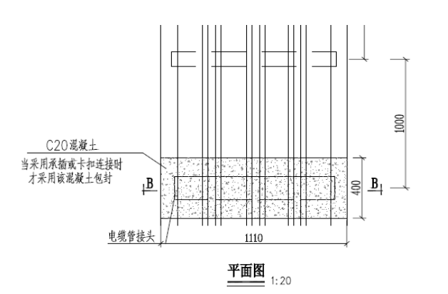 3.2.2 电缆管下为100mm厚C15混凝土,每隔两米设置管枕,当采用承接或卡扣连接时采用C20混凝土包封,宽度为400mm,高度为最上层排管上100mm厚的包封厚度。大样图见下图: