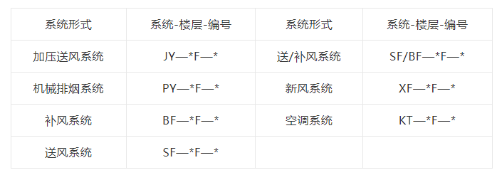 注:第一个*为楼号,第二*为编号,例如1层排烟系统1,表示为PY-1F-1。