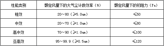 (一)过滤器的分类:按过滤器的性能(效率、阻力、容尘量)进行分类,根据我国有关规范可将过滤器划分为粗效、中效、高效、亚高效、高效和超高效六大类。