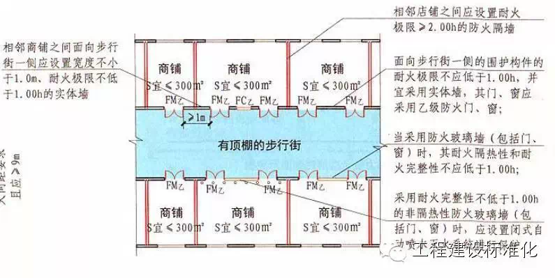 4.步行街两侧建筑的商铺之间,应设置耐火极限不低于2小时的防火隔墙,每间商铺的建筑面积不宜大于300平米;