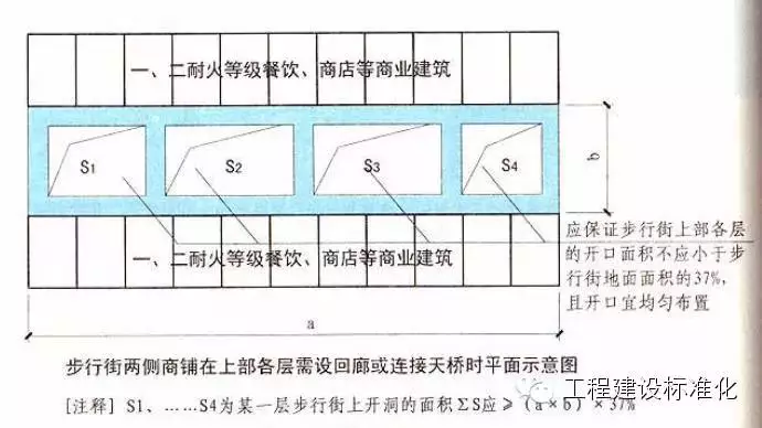 6.步行街两侧的商铺,其上部各层需设置回廊和连接天桥,应保证步行街上部各层楼板的开口面积不小于步行街地面面积的37%,且开口宜均匀布置;