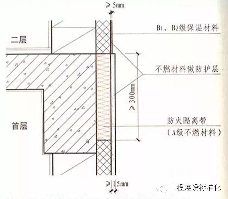 5.在保温系统中每层应设置高度不小于300毫米且燃烧性能为A级的水平防火隔离带。防护层厚度首层不应小于15毫米,其它层不应小于5毫米。