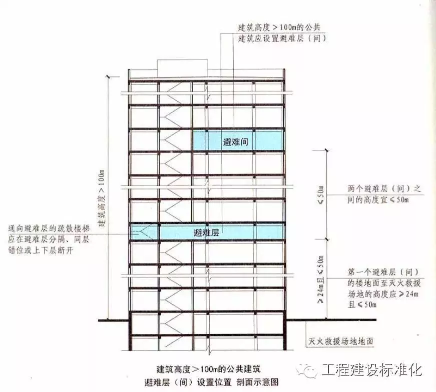 2.完善了公共建筑避难层的防火要求,如第一个避难层(间)的楼地面至灭火救援场地地面的高度不应大于50米,两个避难层(间)之间的高度不宜大于50米;