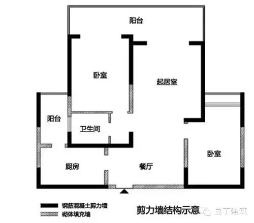 上图是一个比较典型的砌体结构住宅,两室两厅,相信大家都见过类似的房子。图中涂黑的方块是钢筋混凝土构造柱,里面有钢筋,这些是肯定不能破坏的。其余所有淡显填充的墙体,都是砌体剪力墙,原则上,这些也都是不能破坏的。混凝土构造柱和砌体剪力墙,构成了整个竖向结构体系,承载所有的结构荷载。